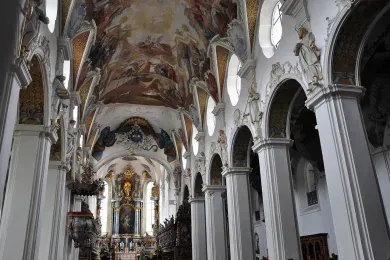 - Das zentrale Fresko an der Decke stellt die Verherrlichung der Gottesmutter Maria dar, umgeben von Engeln und Heiligen. Der gesamte Innenraum ist in zarten Pastelltönen gehalten, die eine leichte, fast himmlische Atmosphäre schaffen. Die kunstvollen Verzierungen und die liebevollen Details lassen dich staunen und machen die Kirche zu einem der schönsten Beispiele barocker Sakralarchitektur in Deutschland.